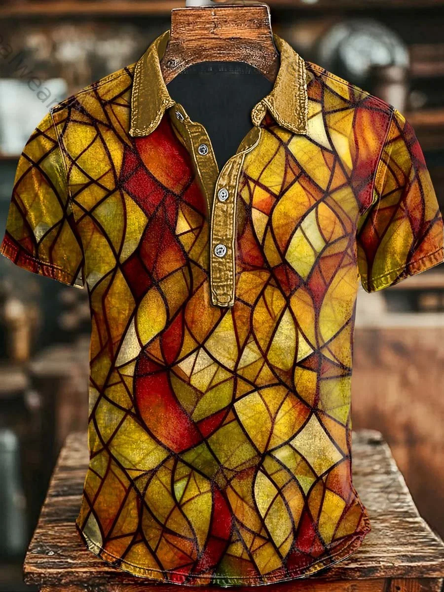 Abstract Window Flower Print Casual Short Sleeve Polo Shirt