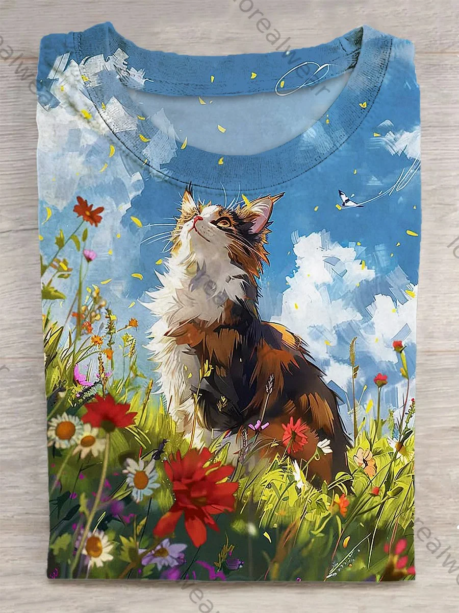 Cat Printed Vintage Fashion Loose Short Sleeve T-Shirt