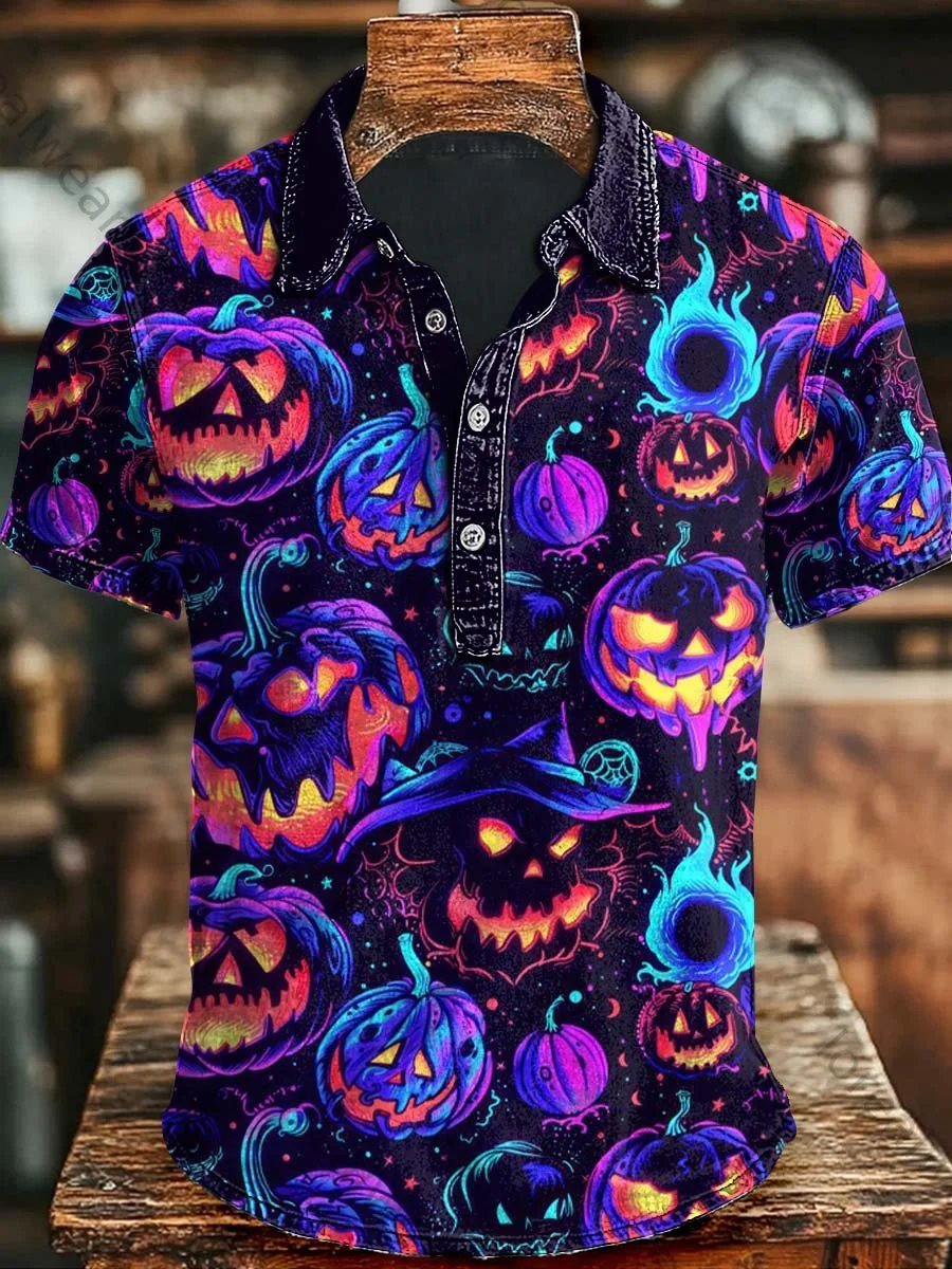 Halloween Evil Pumpkin Print Casual Short Sleeve Polo Shirt